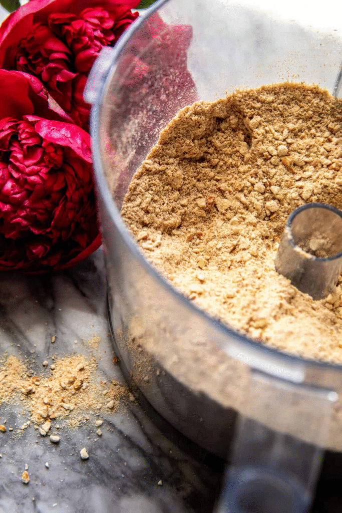 Start by pulsing the mini pretzels in a food processor or blender until you get a coarse flour-like texture. You don’t need them to be perfectly ground—some small chunks are totally fine. The pretzel crumbs will give the topping its signature salty crunch, so you want them to have a bit of texture.