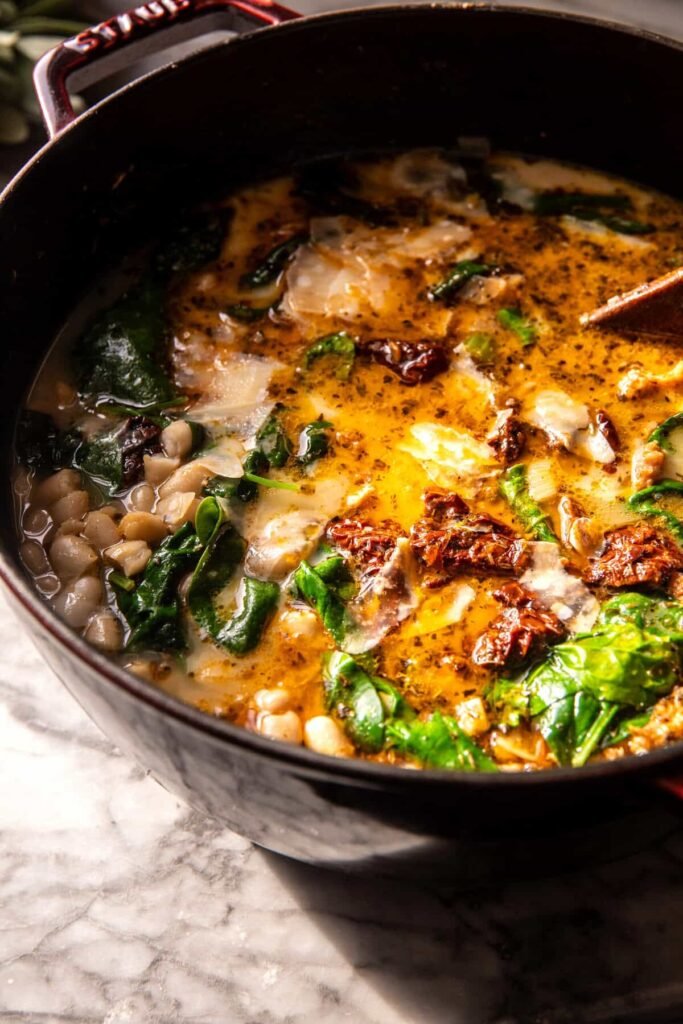 This is my family’s all-time favorite quick and easy Italian-style soup. It’s got spicy Italian chicken sausage cooked with onions, shallots, garlic, and Italian seasoning—all simmered together to make the most wonderfully creamy and slightly spicy soup. We toss in carrots, celery, sun-dried tomatoes, a couple of cans of white beans, and fresh baby spinach. Right before serving, a splash of cream, some parmesan, and a squeeze of lemon juice balance out the spice and add the perfect touch of richness. Ladle it into bowls and finish with extra parmesan and fresh parsley. Honestly, it’s just the yummiest!