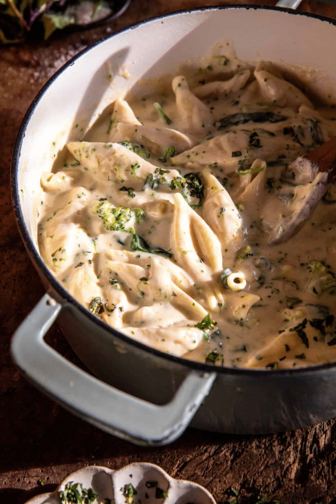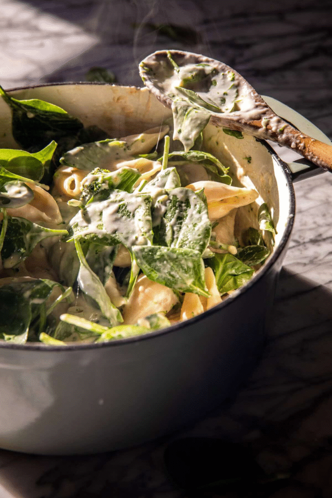 The ricotta is the star here. The pasta I tried used mascarpone, which would also be amazing (cream cheese works too!). But since I always have ricotta on hand, that’s what I used. Toss in the spinach now too.