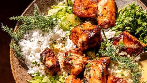 Spicy Honey Mustard Salmon Bowls.