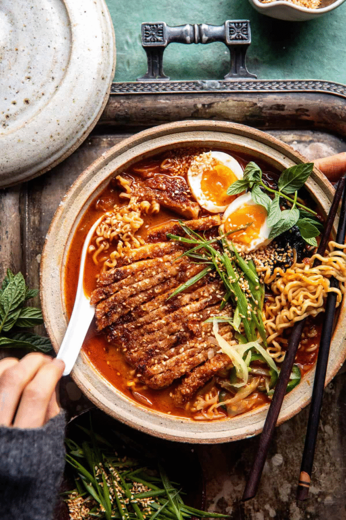 This is the ramen my brother begs me to make all winter long—it’s that good. Imagine a rich, creamy broth with layers of flavor from crispy bacon, two kinds of spicy chili paste (hello, Gochujang and Thai red curry!), coconut milk for sweetness, tamari or soy sauce for that deep umami kick, and peanut butter to make it luxuriously smooth. Every bowl is packed with chewy ramen noodles and golden, crunchy sesame-crusted chicken katsu. Then, we pile on the toppings: jammy soft-boiled eggs, sheets of toasted nori, tangy pickled ginger, fresh scallions, and a ridiculous amount of extra sesame seeds (because they add that perfect nutty crunch, even if they’re technically optional). When it’s cold outside and you need something to warm you up from the inside out, this ramen is the answer.